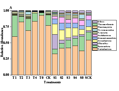 圖3. 不同處理間蚯蚓腸道和土壤細菌在門水平上的相對豐度。相對豐度<1%的類別被歸類為“其他”。