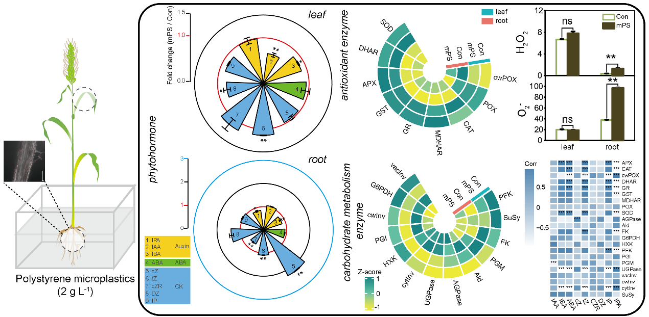 激光共聚焦顯微鏡觀察發現,塑料微??梢员淮篼湼滴铡N⑺芰显诟抵械姆e累導致根系H2O2和O2-含量升高。利用自主建立的歸一化酶組學分析發現,微塑料顯著增加了大麥根中脫氫抗壞血酸還原酶、谷胱甘肽還原酶、ADP-葡萄糖焦磷酸化酶、果糖激酶、磷酸果糖激酶活性,降低了細胞壁過氧化物酶、液泡轉化酶、蔗糖合酶、磷酸葡萄糖變位酶、6-磷酸葡萄糖脫氫酶、磷酸葡萄糖異構酶活性。而塑料微粒對葉片中的碳水化合物代謝酶活性及活性氧代謝酶活性的影響與根系中的表現不同。此外,微塑料導致大麥葉片中反式玉米素含量升高,而吲哚-3-乙酸、吲哚-3-丁酸、二氫玉米素含量降低。研究人員還發現,碳水化合物代謝和活性氧代謝關鍵酶的變化與植物激素濃度具有顯著相關性。研究結果表明,塑料微??蓢乐赜绊懽魑锾即x過程和激素調控網絡,對作物生長發育產生直接影響。因此,未來研究中需更加重視塑料污染對作物生產的影響及其可能造成的生態安全問題。