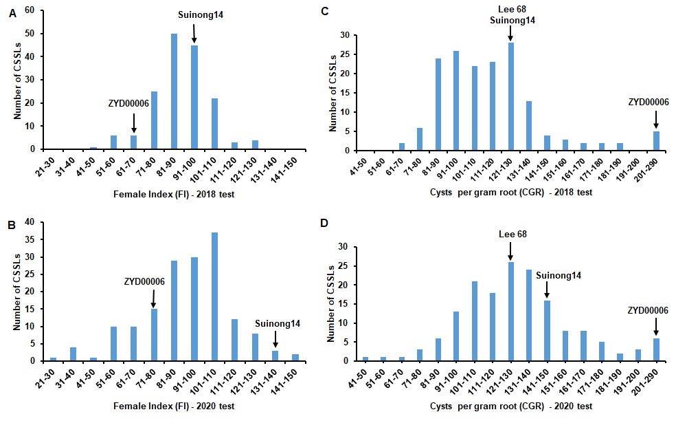大豆孢囊線蟲病是制約大豆生產的全球性病害之一。大豆孢囊線蟲的抗性是由多基因和數(shù)量性狀控制。大多數(shù)研究是基于高抗和高感品種雜交形成的遺傳分離群體,存在高抗基因時,微效基因時常被掩蓋而不能被有效檢測到,然而后代對線蟲的表型反應相對于親本顯現(xiàn)為廣泛的變異。此外,當前對大豆孢囊線蟲的抗性評價是建立在每株孢囊數(shù)與已知感病品種比較所得的雌蟲指數(shù),然而在研究中發(fā)現(xiàn)由于根重大小不一樣,特別是野生品種,僅局限于每株孢囊數(shù)的抗性評價對于育種有一定的局限性。農田有害生物控制學科組王從麗研究員團隊和東北農業(yè)大學陳慶山教授團隊合作首次利用大豆染色體代換系(CSSLs)群體展開了對大豆孢囊線蟲超親遺傳抗性的研究。