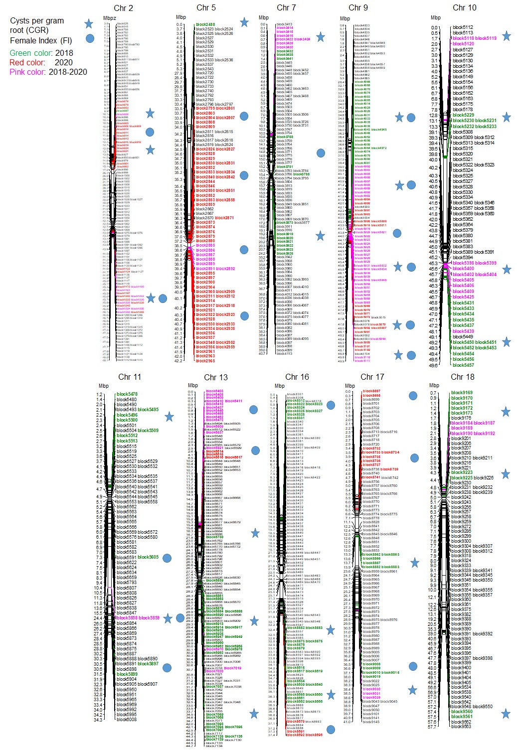CSSLs是通過供體親本多次反復與輪回親本回交,然后經(jīng)基因組標記輔助選擇后自交獲得的群體,染色體片段的代換能夠通過表型的檢測準確的定位與性狀是否相關。因此,通過表型篩選CSSLs可以有效地識別并鑒定微效或主效QTLs。該研究所用CSSLs群體是利用野生大豆ZYD00006為供體親本,黑龍江省當?shù)氐闹髟云贩N綏農14為回交親本的背景,這是我國東北目前唯一一個大豆代換系群體,同時這兩個親本的根重差異比較大,所以是用來評價每克根重孢囊數(shù)的理想群體。該研究通過對162個代換系群體進行表型篩選和高通量測序,首次報道了大豆孢囊線蟲每克根孢囊數(shù)(CGR)的QTL定位,也是首次利用CSSLs來評估大豆孢囊線蟲雌蟲指數(shù)FI和CGR的報道。表型鑒定發(fā)現(xiàn)代換系的FI和CGR分布范圍很廣,有超親后代(圖1);FI和CGR的相關性非常低,CGR和根重的相關性明顯高于FI和根重的關系。利用單因素標記Kruskal-Wallis(K*)分析(P<0.005)及多因子MQM定位方法(LOD>2),總共得到了38個QTLs(圖2),其分布覆蓋了大豆的20條染色體,這些QTLs具有很強的加性效應,解釋了SCN5.6-15.5%的FI表型貢獻率,6.1-36.2%的CGR表型貢獻率。其中有25個QTLs抗性來自于ZYD00006,13個QTLs來自于綏農14,表明感病的雙親對于超親遺傳都有貢獻,同時間接解釋了SCN抗性的復雜性及其與目前已經(jīng)報道分布于所有染色體數(shù)量多于300個QTLs的原因。研究發(fā)現(xiàn)在缺少SCN主要抗性基因(如rhg1和Rhg4)的情況下,綜合考慮FI、CGR及根重三者有利基因的組合可以有效抑制線蟲繁殖,這對高效育種具有重要的指導意義。同時發(fā)現(xiàn)對SCN有耐性并適合于東北種植的具有綏農背景的代換系株系具有潛在的應用價值。