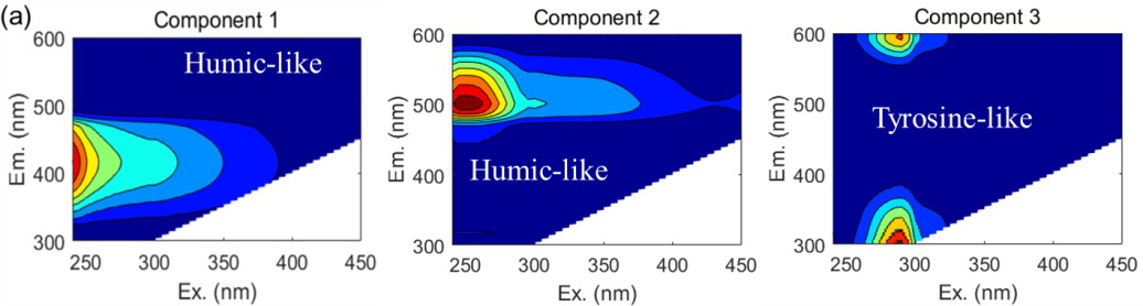 圖1.三維熒光平行因子法識別的DOM組分及其在城市和非城市水體中的分布