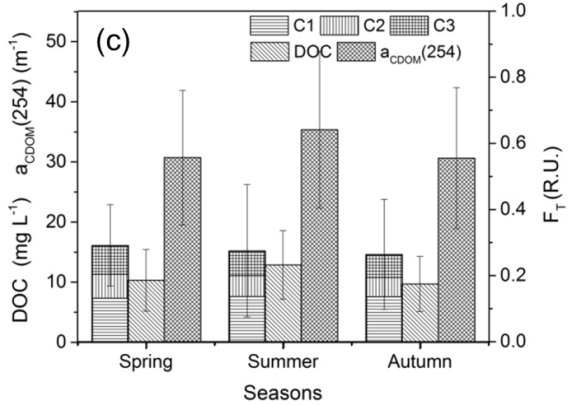 圖2. 城市水體DOM的組分、濃度的年內(nèi)季節(jié)變化及年際變化