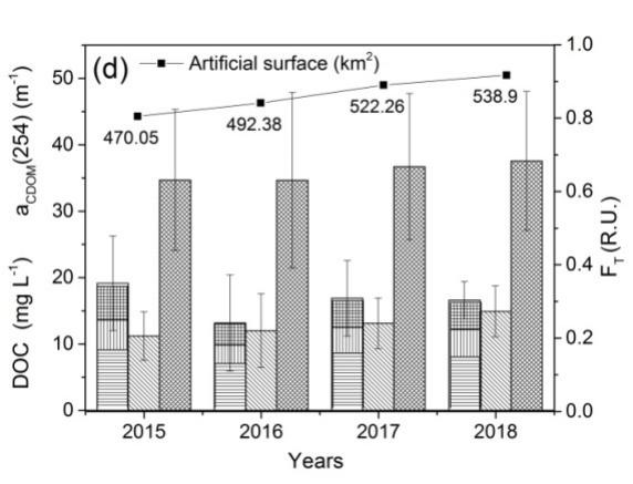 由于DOM的組分復(fù)雜且難以分離,目前多使用光譜代理參數(shù)如某波段的吸收系數(shù)aCDOM(440)、光譜斜率S275-295、M值及特征吸收SUVA(254)來表征其濃度,指示其來源、芳香性和分子量大小。近年來,隨著三維熒光技術(shù)(EEMs)及其譜圖識別技術(shù)的發(fā)展,為識別DOM組分開辟了新思路。先后出現(xiàn)了尋峰法、平行因子法(PARAFAC)、面積積分法(FRI)來識別DOM的組分并確定其來源。因此,中國科學(xué)院東北地理與農(nóng)業(yè)生態(tài)研究所水環(huán)境遙感學(xué)科組的科研人員自2015年至2018年長達四年時間,定點監(jiān)測采集了長春市區(qū)內(nèi)15個城市水體及8個周邊非城市水體,共計獲取398個實測DOM數(shù)據(jù),借助三維熒光及平行因子技術(shù)對比分析了城市水體DOM的光學(xué)及組分特征,追溯了其來源,同時研究了DOM的年內(nèi)季節(jié)變化及年際變化。研究結(jié)果表明,城市水體和非城市水體DOM均受陸源輸入影響較大,其中城市水體水質(zhì)較差多呈現(xiàn)富營養(yǎng)化,且城市水體DOM濃度明顯高于非城市水體(11.12 ± 5.36 mg L-1 > 7.46 ± 2.62 mg L-1),其蛋白類組分豐度也明顯高于非城市水體(26% > 21.3%)。此外,我們還發(fā)現(xiàn)DOM在夏季具有較高濃度由于其強降雨和藻類生長的雙重作用,且隨著城市建成區(qū)面積的擴張DOM濃度也略有升高,這些發(fā)現(xiàn)填補了城市范圍內(nèi)水-陸相互作用下的DOM特征及變化研究的空白,也說明城市水體受到人為因素干擾已日趨惡化,在此呼吁廣大居民應(yīng)提高環(huán)保意識,守護我們的藍天綠水,同時本研究也為城市水環(huán)境監(jiān)測和管理提供了技術(shù)支撐。