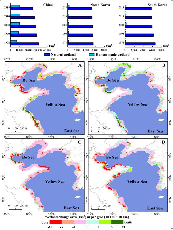東亞-澳大利西亞水鳥遷徙廊道是全球最大的水鳥遷徙路徑之一,其中環(huán)黃渤海濕地是最為重要的棲息生境,對(duì)于遷徙水鳥的保護(hù)具有重要的作用。環(huán)黃渤海地區(qū),地跨朝鮮半島西海岸和中國(guó)江蘇啟東市以北長(zhǎng)度超過1萬公里的海岸線,是東北亞地區(qū)經(jīng)濟(jì)快速發(fā)展的重點(diǎn)區(qū)域之一,因此區(qū)域濕地和遷徙水鳥受人為脅迫干擾嚴(yán)重。準(zhǔn)確理解濕地分布范圍、變化趨勢(shì)和主要驅(qū)動(dòng)因素對(duì)于保護(hù)濕地生態(tài)系統(tǒng)和生物多樣性等具有重要的科學(xué)意義和社會(huì)價(jià)值,是學(xué)術(shù)界重點(diǎn)關(guān)注的熱點(diǎn)話題。然而,環(huán)黃渤海地區(qū)長(zhǎng)時(shí)間序列濕地生境及其人為脅迫的跨境對(duì)比分析方面仍存在明顯的不足。