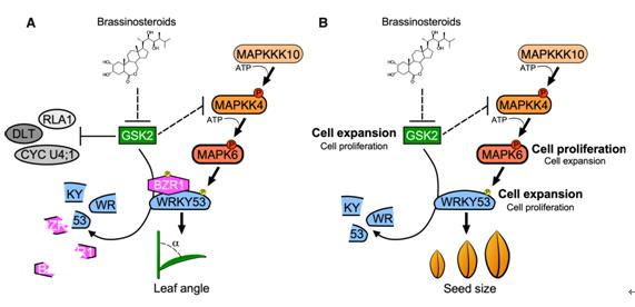 該團隊在前期的工作中發現,OsWRKY53正調控水稻粒型和葉傾角的大小,是水稻BR信號的正調控因子;OsMAPK6能夠磷酸化OsWRKY53,而且OsMAPK6對OsWRKY53的磷酸化能夠增強OsWRKY53的生物功能。在此基礎上,通過分析OsWRKY53與OsMAPKKK10-OsMAPKK4-OsMAPK6組分的雙突變體表型,在遺傳學上證明OsWRKY53是MAPK信號的底物,能夠參與調控水稻葉傾角和粒型。