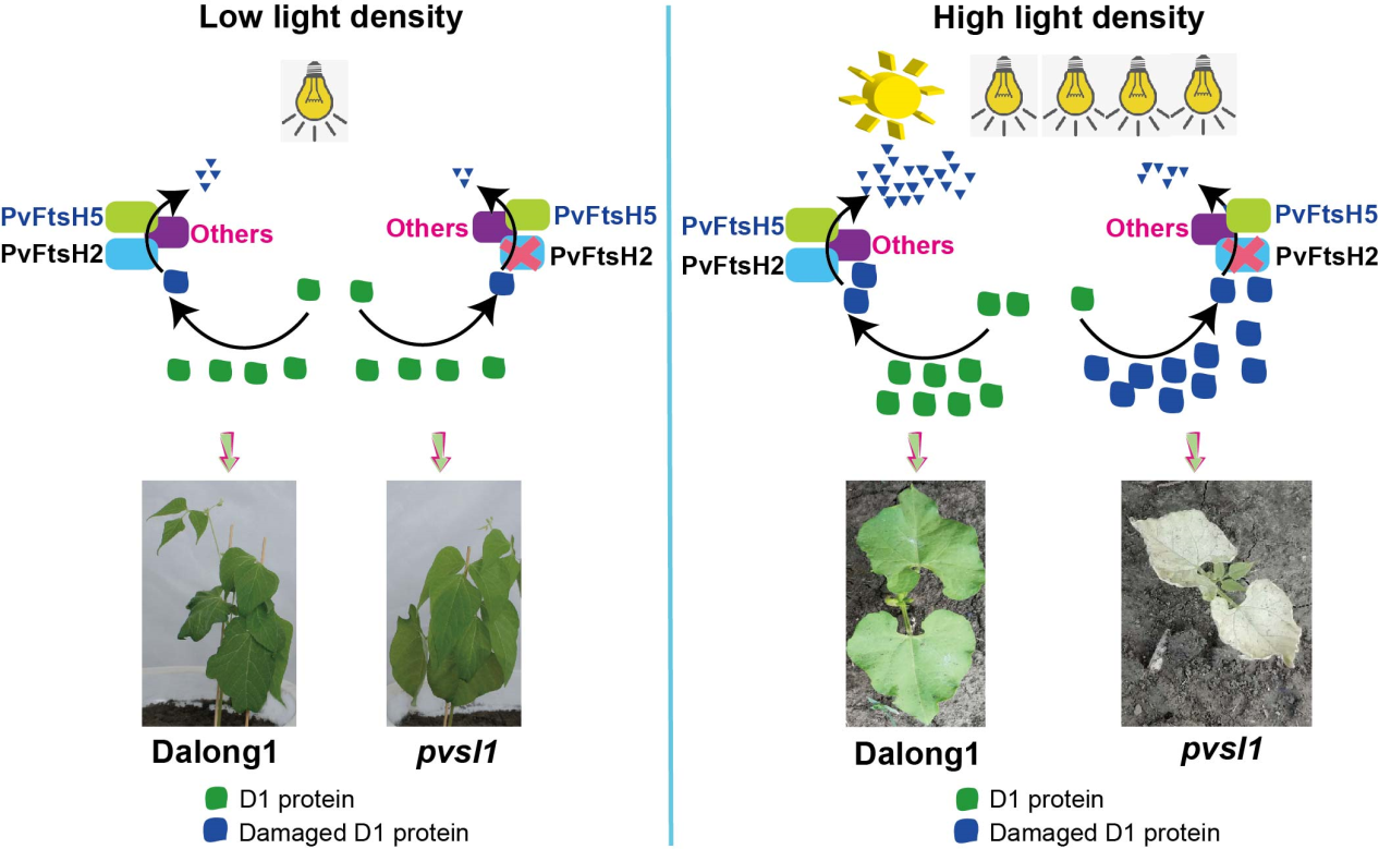 東北地理所夏正俊課題組在Horticulture Research上發表了題為A critical role of PvFtsH2 in the degradation of photodamaged D1 protein in common bean的研究論文。本研究以中國菜豆品種大龍1號為背景材料,在60Co輻射創制突變體材料中發現一幼苗致死的pvsl1突變體,該突變體出苗后在田間或高光強下2周內死亡;在溫室中低光強下則表現為失綠表型,還可正常開花結實。經INDEL分子標記將PvSL1候選基因定位在2號染色體53.7 kb區域內,候選基因Phvul.002G190900的CDS區域在pvsl1突變體中發生了1 bp的缺失,導致蛋白翻譯提前終止。Phvul.002G190900基因(PvFtsH2)的表達量隨光強增強而上調,在pvsl1突變體中其表達量明顯下調。pvsl1突變體中PvFtsH2蛋白功能的喪失導致高光強下受損傷的D1蛋白不能被及時降解清除、造成PSⅡ的不可逆損害,使得光合作用能力下降、葉片細胞死亡,進而引致植株整體死亡。在pvsl1突變體中PvFtsH5和PvFtsH8的表達量上調,暗示其他FtsH家族成員亦具有部分補償PvFtsH2降解清除光損傷D1蛋白的能力,使得pvsl1突變體在低光強下能夠完成營養生殖生長。該研究結果揭示了PvFtsH2蛋白對確保菜豆光合系統在強光下正常運轉發揮著重要的功能。