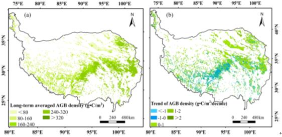圖1 2000-2019年青藏高原沼澤濕地植被地上生物量密度多年平均及變化趨勢(shì)