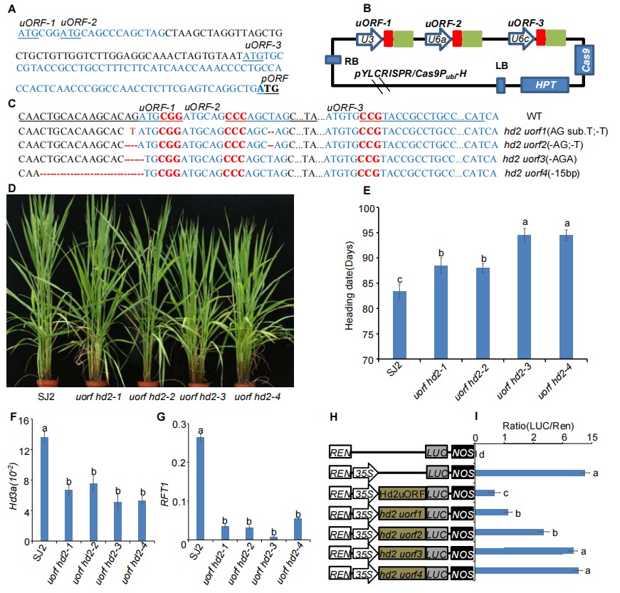 為了利用基因編輯手段提高靶基因的表達(dá)量,該團(tuán)隊(duì)擬對(duì)基因的上游開放閱讀框架(open reading frames, uORFs)進(jìn)行編輯。研究表明,uORFs可以抑制開放閱讀框架(primary ORFs, pORFs)的翻譯,通過(guò)編輯和突變這些uORFs可以達(dá)到提高pORFs的蛋白水平的目的。本實(shí)驗(yàn)室前期研究發(fā)現(xiàn)Hd2是控制東北水稻開花最重要的抑制子之一,序列分析發(fā)現(xiàn)Hd2在5'UTR區(qū)域存在3個(gè)uORF,因此,該研究團(tuán)隊(duì)針對(duì)3個(gè)uORF分別設(shè)計(jì)3個(gè)靶位點(diǎn)進(jìn)行基因編輯,獲得了多種不同編輯類型,抽穗期統(tǒng)計(jì)結(jié)果顯示,突變體出現(xiàn)不同程度晚花(4.6天-11.2天),其中第一個(gè)uORF突變的晚花效果最明顯。突變體中,抽穗期基因Ehd1、Hd3a和RFT1的表達(dá)量都低于野生型,與其晚花表型一致。進(jìn)一步將Hd2 uORF與4種突變類型uorf插入到35S啟動(dòng)子與LUC報(bào)告基因之間,瞬時(shí)轉(zhuǎn)化原生質(zhì)體,發(fā)現(xiàn)Hd2 uORF的突變與否并不影響報(bào)告基因LUC的轉(zhuǎn)錄水平,但是Hd2 uORF的插入顯著降低了LUC的熒光信號(hào),而uorf的突變可以不同程度的恢復(fù)LUC的蛋白量,證實(shí)了Hd2 uORF的突變可以通過(guò)提高Hd2 pORF的翻譯達(dá)到增強(qiáng)Hd2功能的效果,從而實(shí)現(xiàn)不同程度延遲開花的目的,這表明對(duì)于Hd2 uORF的編輯突變可以作為未來(lái)微效改變水稻開花性狀的有效靶點(diǎn)。