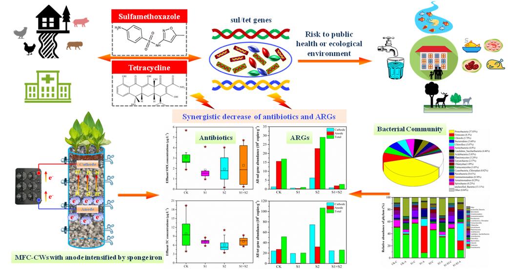中科院東北地理與農(nóng)業(yè)生態(tài)研究所水環(huán)境污染與防治學(xué)科團(tuán)隊(duì)選擇磺胺甲惡唑(SMX)和四環(huán)素(TC)兩種典型抗生素,探究了MFC-CWs對(duì)抗生素的去除過(guò)程、關(guān)鍵影響因素與機(jī)理;在前期獲得的科學(xué)認(rèn)知的基礎(chǔ)上,進(jìn)一步對(duì)MFC-CWs的主要功能區(qū)進(jìn)行了優(yōu)化,研發(fā)了基于海綿鐵-陽(yáng)極區(qū)強(qiáng)化的抗生素與ARGs高效協(xié)同去除技術(shù)。