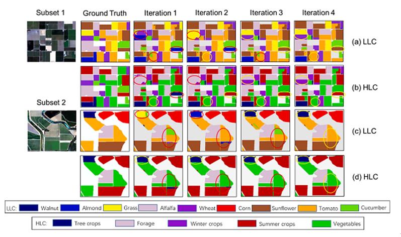 研究人員使用UAVSAR(S1)和Rapideye(S2)兩種高分遙感影像對研發的IDL有效性進行了驗證。研究結果表明,迭代深度學習IDL方法可同時提高LLC和HLC分類精度,且算法效率極高,僅用四次迭代LLC和HLC同時達到了最高精度。DIL生產的LLC和HLC分類精度比面向對象分類方法等優秀方法分別高4-7%和2-5%。本研究為復雜地區農作物種植結構信息的智能提取提供了全新的解決思路。