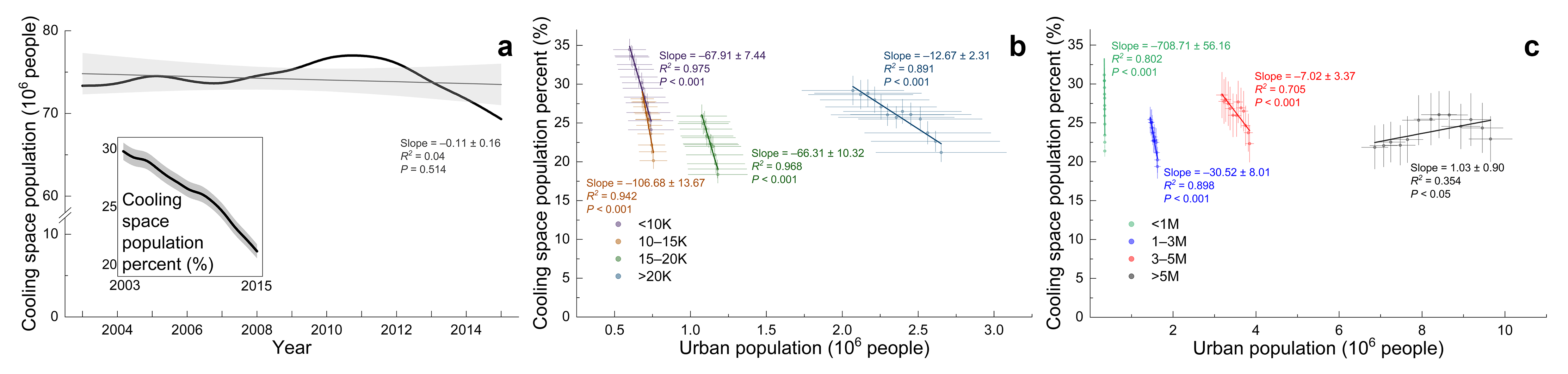 進(jìn)一步分析表明,UGS的減少直接導(dǎo)致了UGS在夏季的降溫空間收縮。主城區(qū)的UGS降溫空間覆蓋度從32.55%下降到24.39%,在欠發(fā)達(dá)城市同樣較快。因此,越來越多的城市居民失去了在夏季接觸UGS降溫的機會,享受UGS降溫的居民比例從29.79%下降到21.17%,這個下降速度快于UGS覆蓋率的下降速度。在2003-2015年,在夏季不能接觸UGS降溫服務(wù)的居民人數(shù)每年增長約423萬。在2015年,約2.6億城市居民不能接觸UGS的降溫服務(wù),接近于世界第三人口大國的人口數(shù)量。造成這種情況的原因一方面是UGS的快速減少,另一方面是因為城市居民的增長區(qū)域缺少UGS降溫空間的覆蓋。因此,為了緩解城市熱挑戰(zhàn)、全面實現(xiàn)中國城市的可持續(xù)發(fā)展,制定有針對性的城市綠化方案勢在必行,并且應(yīng)該特別關(guān)注那些經(jīng)濟(jì)實力較弱、人口較少的欠發(fā)達(dá)城市。