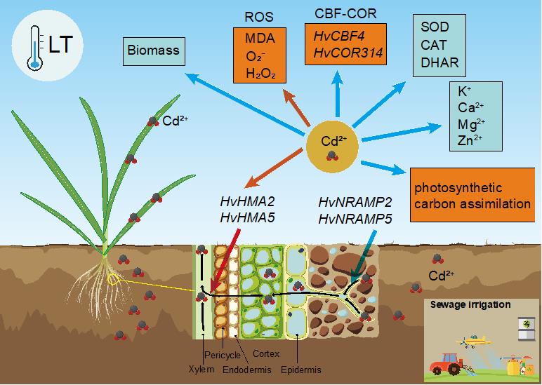 由于人類活動造成重金屬在環(huán)境中過度積累。中國重金屬污染土壤總面積超過2000萬公頃,污水灌溉的土壤有26.4%受到重金屬污染。農(nóng)業(yè)生態(tài)系統(tǒng)中重金屬的積累可能會對作物生產(chǎn)產(chǎn)生不利影響。然而,目前我們對用含鎘(Cd)污水灌溉是否會影響作物的低溫耐受性知之甚少。此外,脫落酸(ABA)參與誘導植物對低溫和Cd的抗性調(diào)控過程。為此,東北地理所作物生理與栽培學科組研究人員以大麥野生型及其ABA缺失突變體為研究對象,針對土壤Cd污染影響大麥低溫抗性生理機制開展研究工作。