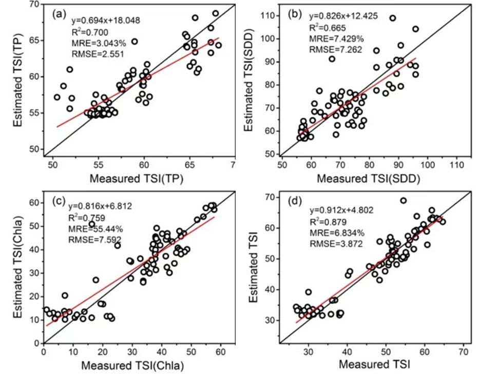 圖1. 各參數及綜合營養狀態指數實測值與估算值散點圖,(a): TSI(TP)、(b): TSI(SDD)、(c): TSI(Chla) 和(d):TSI。