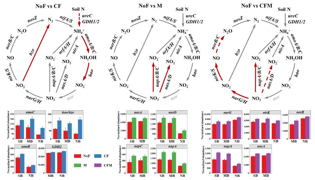 在此基礎(chǔ)上,團(tuán)隊(duì)進(jìn)一步利用高通量宏基因組測序技術(shù),針對黑土農(nóng)田碳氮循環(huán)功能基因進(jìn)行分析。結(jié)果顯示,單施有機(jī)肥或與化肥配施顯著改變黑土碳氮功能基因的群落結(jié)構(gòu),增加了纖維素和果膠降解的涉碳基因豐度;而長期單施化肥顯著積累了黑土氨氧化作用相關(guān)功能基因豐度,可能導(dǎo)致硝酸鹽富集淋失及N2O排放增加(圖1);同時(shí)發(fā)現(xiàn)長期有機(jī)肥添加顯著富集同化和異化硝酸鹽還原作用相關(guān)功能基因,這有助于提升黑土銨態(tài)氮含量及氮肥利用率(圖2);然而,有機(jī)肥化肥配施會進(jìn)一步導(dǎo)致黑土反硝化作用相關(guān)功能基因豐度的顯著增加,表明過量氮素養(yǎng)分投入可造成土壤氮素通過氣態(tài)形式損失的風(fēng)險(xiǎn)(圖2)。該研究為推進(jìn)黑土區(qū)化肥減量化,構(gòu)建有機(jī)肥施用長效機(jī)制提供微生物學(xué)理論依據(jù)。
