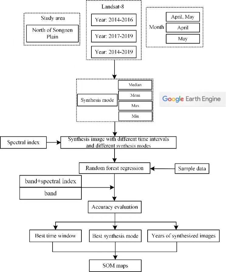中國科學院東北地理所農業遙感學科組基于Google Earth Engine云平臺結合機器學習算法與實地采樣數據,分別從多時相影像合成、時間窗口選擇、輸入量優選、局部回歸等多角度提升土壤有機質的制圖精度,研發了一系列適用于東北黑土區的高魯棒性土壤有機質制圖方法(圖1&2)。