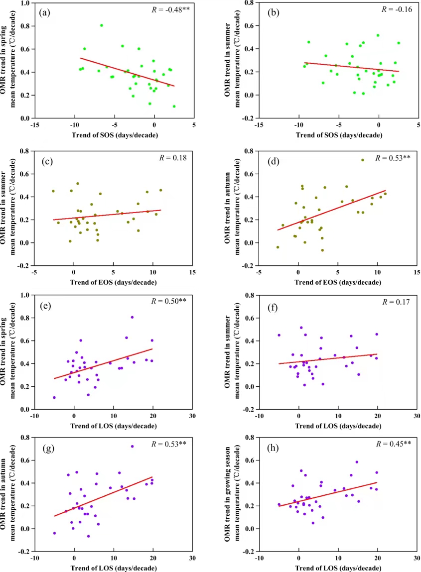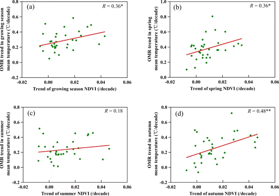 基于觀測和再分析氣象數(shù)據(jù),土地利用/覆被數(shù)據(jù),植被指數(shù)、地表反照率、蒸散等數(shù)據(jù),采用 “觀測減去再分析”(簡稱OMR)方法,東北地理所濕地生態(tài)系統(tǒng)管理學科組分析了溫帶草原植被活動和物候變化對氣溫的影響。研究結(jié)果表明,在過去30多年,溫帶草原植被活動增強,生長季開始期提前,結(jié)束期推遲,導致生長季長度延長。在春季和秋季,植被變化引起的地表蒸散變化較弱,因此植被活動增強、物候開始期提前和結(jié)束期推遲能夠通過降低地表反照率,對春季和秋季氣溫帶來一定的增溫作用。在夏季,植被活動的增強一方面可以引起地表蒸散的增加帶來一定降溫作用,另一方面導致地表反照率降低引起一定的升溫作用,最終導致其對夏季溫度沒有顯著的影響。因此,溫帶草原植被在生長季活動增強及生長季長度的延長總體會對生長季氣溫帶來增溫作用。研究表明氣候變化引起的溫帶草原植被活動和物候變化會進一步對氣候帶來影響,因此利用氣候模型來模擬溫帶草原區(qū)氣候變化時,還需要考慮植被活動和物候變化對區(qū)域氣候的影響。