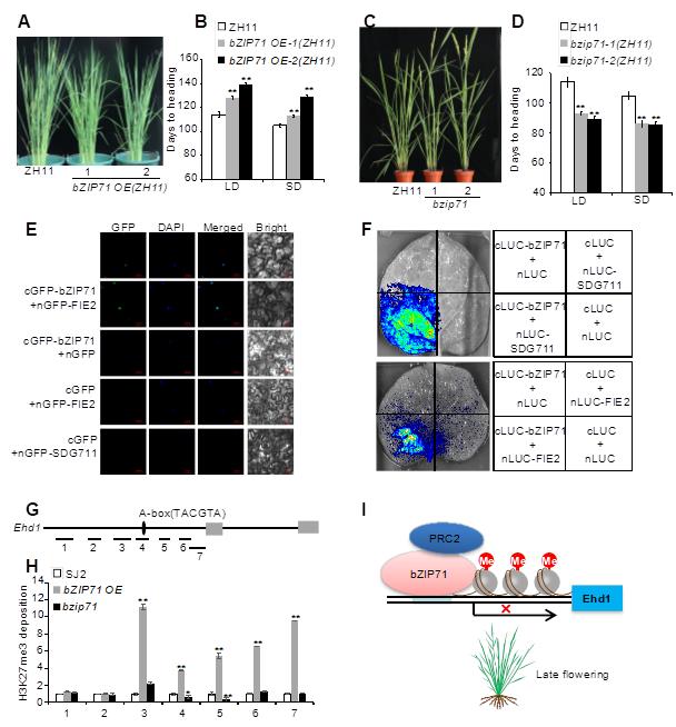 該項研究揭示了bZIP71調控水稻抽穗期的新機制,其功能發揮不依賴于Hd2、Hd4和Hd5,而是通過與多梳抑制復合體2(PRC2)的兩個成員SDG711和FIE2的互作,調控Ehd1的H3K27me3水平。