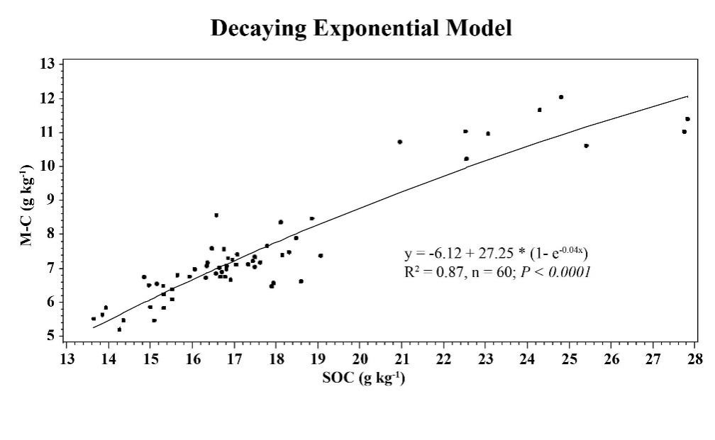 微生物殘體穩定性較高,對土壤有機碳(SOC)的長期固存具有重要作用。氨基糖的主要來源是真菌和細菌且在土壤中很穩定。氨基糖對秸稈還田和耕作方式響應很明顯,不同作物還田對氨基糖的影響也不一致。中科院東北地理所黑土有機碳與保護性耕作學科組科研人員依托吉林省德惠市始建于2001年的保護性耕作長期定位實驗開展了相關研究,包含5個處理:免耕玉米-大豆輪作(NTCS)、秋翻玉米-大豆輪作(MPCS)、免耕玉米連作(NTCC)、秋翻玉米連作(MPCC)、常規耕作玉米連作且秸稈不還田(CTCC)。于2017年采集了不同深度的土壤樣品,測定氨基糖以計算微生物殘體碳、真菌殘體碳)和細菌殘體碳及其儲量。三因素方差分析表明,耕作方式、深度及其交互作用對所有氨基糖含量均有顯著影響。然而,不同土層的兩因素方差分析表明,耕作方式對所有氨基糖的影響主要發生在0-5cm土層。衰減指數模型(decaying exponential model,圖1)表明微生物殘體碳和SOC之間的關系(R2=0.87)。耕作對微生物殘體碳、真菌殘體碳和細菌殘體碳的儲量有很大影響,但對它們在SOC儲存中的分布比例沒有影響。