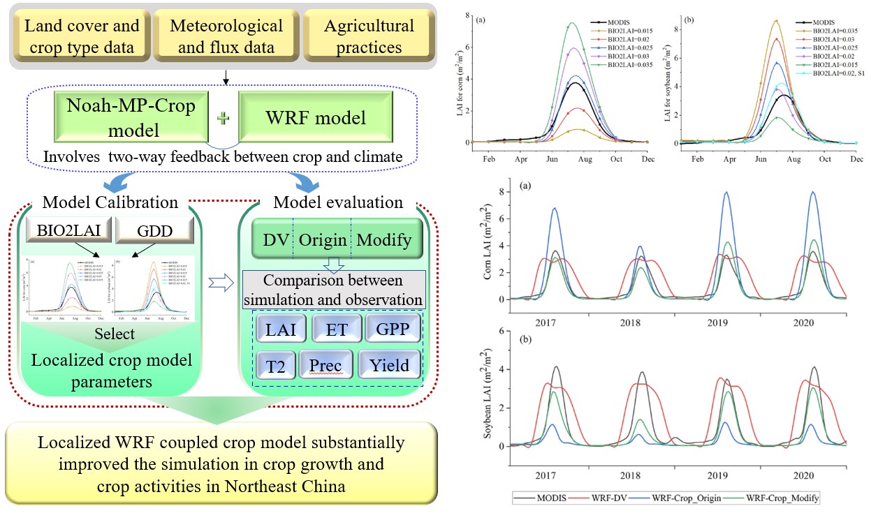 研究成果于近期以“Coupling localized Noah-MP-Crop model with the WRF model improved dynamic crop growth simulation across Northeast China”為題在Computers and Electronics in Agriculture上發(fā)表,由中科院東北地理所于靈雪副研究員、卜坤高級(jí)工程師、鄭興明副研究員、張樹文研究員,美國(guó)太平洋西北國(guó)家實(shí)驗(yàn)室劉野博士,長(zhǎng)春師范大學(xué)劉廷祥博士,中國(guó)科學(xué)院大氣物理研究所于恩濤博士、中國(guó)氣象局大氣環(huán)境研究所賈慶宇博士、中國(guó)科學(xué)院沈陽(yáng)生態(tài)研究所沈歷都博士等共同完成。該研究得到了中國(guó)科學(xué)院戰(zhàn)略性先導(dǎo)科技專項(xiàng)課題(XDA28080500),國(guó)家自然科學(xué)基金、吉林省科學(xué)基金、中國(guó)科學(xué)院東北地理與農(nóng)業(yè)生態(tài)研究所創(chuàng)新團(tuán)隊(duì)項(xiàng)目的資助。