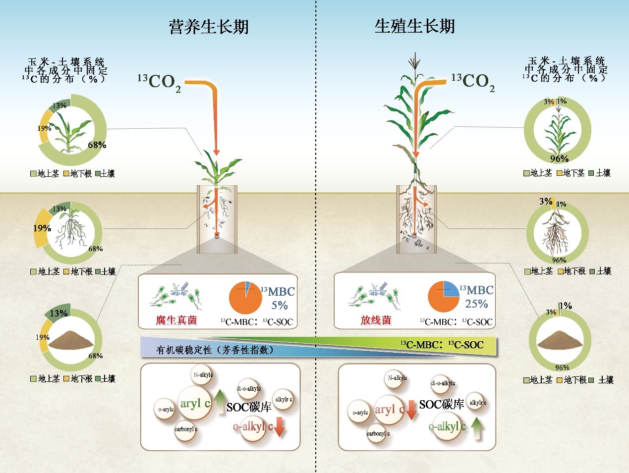 結(jié)果表明,腐生真菌在營(yíng)養(yǎng)期對(duì)標(biāo)記C的摻入起重要作用,而放線菌在生殖期占優(yōu)勢(shì)。此外,固定在微生物生物量C(13C-MBC)中的標(biāo)記C對(duì)固定在土壤有機(jī)C(13C-SOC)中的總標(biāo)記C的貢獻(xiàn)從營(yíng)養(yǎng)期的5%增加到生殖期的25%,盡管在兩個(gè)生長(zhǎng)階段13C-MBC的量幾乎相同。營(yíng)養(yǎng)期和生殖期土壤C化學(xué)組成的差異主要體現(xiàn)在芳基C和O-烷基C中,營(yíng)養(yǎng)期的芳基C比例較高,生殖期的O-烷基碳比例較高。此外,腐生真菌和放線菌與各個(gè)玉米生長(zhǎng)階段SOC中較高比例的芳基C和O-烷基C有關(guān)。研究結(jié)果強(qiáng)調(diào)了土壤微生物在玉米生長(zhǎng)過(guò)程中對(duì)根際碳沉積的連續(xù)處理和螯合中的重要作用。進(jìn)一步的研究應(yīng)更多地關(guān)注不同作物品種和田間條件下管理實(shí)踐中SOC形成所涉及的微生物過(guò)程,以闡明根際沉積對(duì)固碳和土壤肥力的重要性。