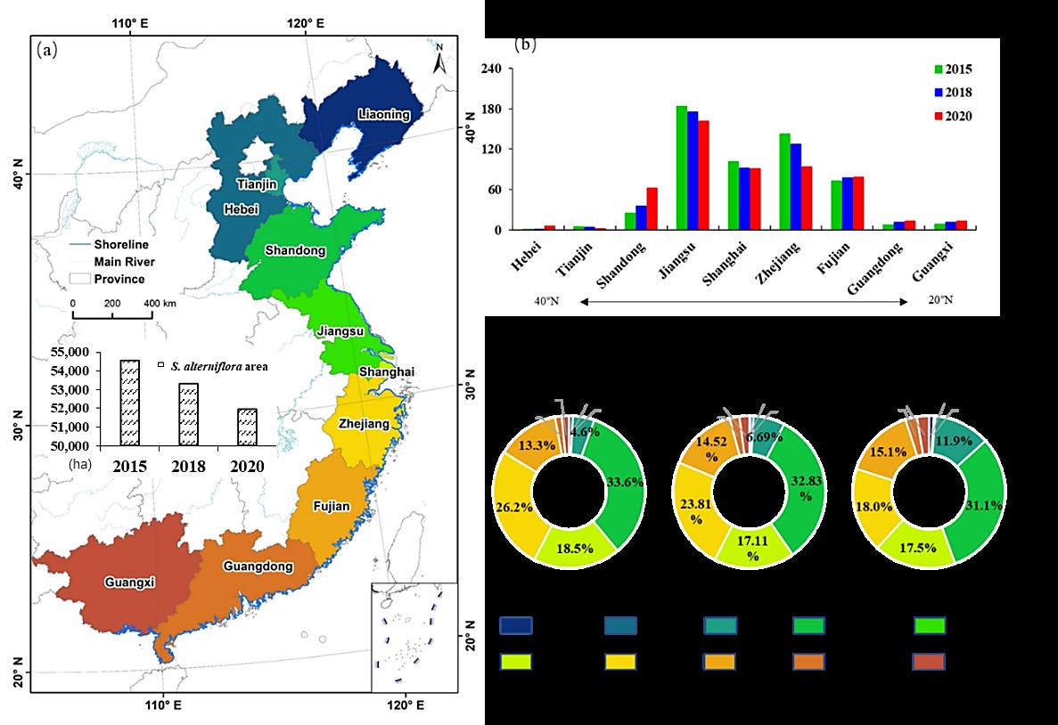 圖1. 2015、2018和2020年中國沿海省份互花草入侵情況(a)、各省互花米草面積變化(c)、各省互花米草占比
