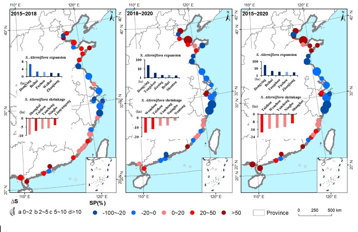中科院東北地理所地理景觀遙感學科組研究人員,基于遙感大數據和地面調查樣點,應用已研發的集成面向對象和支持向量機的互花米草分布信息提取方法,獲取了2015(SDGs元年)、2018和2020年(相關SDGs完成年)中國濱海互花米草分布數據集及入侵土地覆被類型數據集;在國家、省域及熱點城市三個尺度上解析了2015-2020年中國濱?;セ撞莸臅r空變化特征;評估了面向SDGs的中國互花米草治理成效及存在問題。