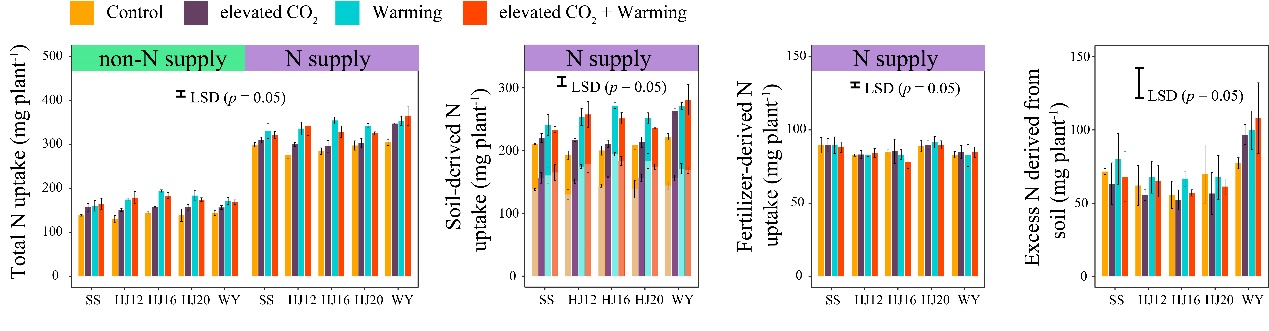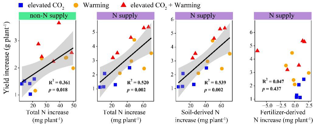 東北地理所農(nóng)田分子生態(tài)學科組科研人員選用東北地區(qū)主栽水稻品種五優(yōu)稻1號譜系中不同年代培育的5個水稻品種為試驗材料,利用OTC模擬CO2升高(700 ppm)和升溫(比環(huán)境氣溫高2℃)條件,采用15N標記技術(shù)示蹤水稻吸收來源于肥料的氮素,以解析氣候變化條件下水稻氮源與產(chǎn)量的關(guān)系;采用根箱試驗和15N-13C雙標技術(shù),探究了大氣CO2和溫度升高對水稻根際氮礦化和相關(guān)功能基因豐度的影響。結(jié)果發(fā)現(xiàn):在不施氮條件下,大氣CO2和溫度升高使5個品種水稻的平均產(chǎn)量和氮吸收分別增加28.4%和25.2%;在施氮條件下,水稻平均產(chǎn)量和氮吸收分別增加23.0%和15.3%(圖1,圖2)。氣候變化條件下,水稻增加的氮吸收主要來自土壤,并且與水稻增產(chǎn)量呈顯著正相關(guān)關(guān)系(圖3);而肥料氮的吸收量未發(fā)生顯著變化。研究還發(fā)現(xiàn),氮肥施用促進水稻對土壤氮素的吸收,而水稻品種改良并沒有改變水稻氮素吸收對氣候變化的響應(yīng)。這表明氣候變化條件下會加快黑土區(qū)水稻土壤氮庫的消耗。因此,培育高氮肥料利用率的水稻品種可能是未來黑土區(qū)水稻生產(chǎn)應(yīng)對氣候變化的有效策略。