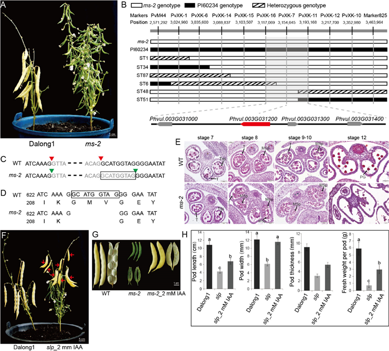 東北地理所研究團隊利用SNP測序和自主設計的菜豆InDel分子標記,通過圖位克隆的方法精細定位了菜豆雄性育性基因MS-2為Phvul.003G031200基因(圖B);在ms-2突變體中Phvul.003G031200基因剪切位點發(fā)生變異,使得蛋白質(zhì)序列缺少3個氨基酸(圖C-D);利用石蠟切片對小孢子體發(fā)育過程進行觀察,發(fā)現(xiàn)MS-2基因的剪切位點變異導致絨氈層降解提前是ms-2突變體雄性不育的原因(圖E)。ms-2突變體可結(jié)實大量的無籽肉莢,外源噴施2 mM生長素物質(zhì)吲哚乙酸(IAA)能使ms-2突變體上的肉質(zhì)無籽莢的莢長、莢寬、莢厚和單莢鮮重顯著增加(圖F-H),體積增大的無籽肉莢具有加工或直接食用的潛能。本研究定位與克隆了菜豆雄性育性基因MS-2.明確了該基因突變導致菜豆不育的機理。MS-2基因可應用于培育肉質(zhì)無籽莢菜豆品種,具有很好的應用價值,同時為雜種優(yōu)勢的利用奠定了堅實的理論基礎。