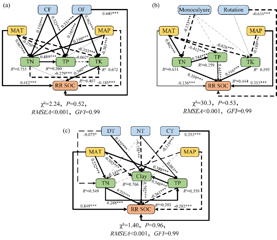 此外,meta分析土壤有機碳含量的效應值大小與粘土含量和土壤養分顯著相關。土壤有機碳和養分含量的增加也與東北地區獨特的氣候(MAT和MAP)和粘粒含量密切相關(圖2)。Meta分析總體上對土壤管理類型對有機碳含量的影響進行了全面的定量評估,這將有助于進一步了解土壤SOC含量對不同土壤管理類型的響應,并有助于確定東北地區最適宜的土壤管理類型。
