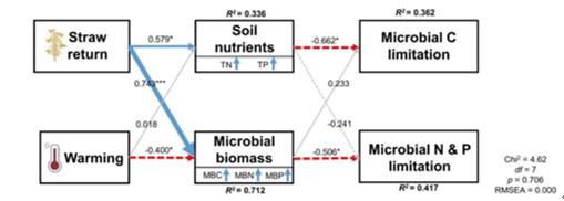 研究表明,短期增溫和秸稈還田除對土壤全氮含量具有顯著影響外,對其它基本土壤理化性質(zhì)無顯著影響。秸稈還田顯著增加了土壤微生物生物量碳和細菌豐度(16S基因拷貝數(shù)),而增溫顯著降低了土壤微生物生物量碳和細菌豐度。秸稈還田顯著緩解了微生物磷限制,但增溫和秸稈還田耦合削弱了這一作用效果(圖1)。增溫和秸稈還田主要通過土壤養(yǎng)分含量變化影響微生物碳限制,通過影響微生物生物量進一步調(diào)控微生物氮磷限制(圖2)。研究結(jié)果闡明了增溫和秸稈還田耦合對土壤微生物養(yǎng)分限制的影響機制,進一步加深了對溫帶農(nóng)田生態(tài)系統(tǒng)養(yǎng)分循環(huán)的認識。