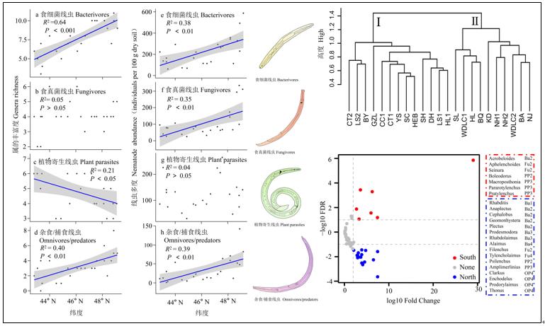 此外,利用形態(tài)學鑒定技術(shù)首次全面評估了土壤線蟲群落結(jié)構(gòu)在典型黑土區(qū)的緯度分布格局。研究發(fā)現(xiàn)土壤線蟲總豐富度和總多度的緯度分布格局與土壤有機碳生物降解性類似,均呈現(xiàn)均隨緯度增加而顯著增加的變化趨勢;并且線蟲群落以47°N為分界線可分為南部和北部兩類,土壤pH和土壤容重分別是影響南部與北部黑土區(qū)線蟲群落最重要的環(huán)境因子。
