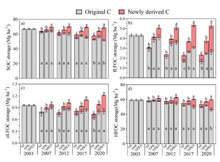圖1. 2003-2020年間不同施肥方式下土壤及其組分中新、老碳的儲量變化