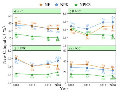 圖2. 2003-2020年間不同施肥方式下外源碳在全土和有機碳組分中的轉(zhuǎn)化率