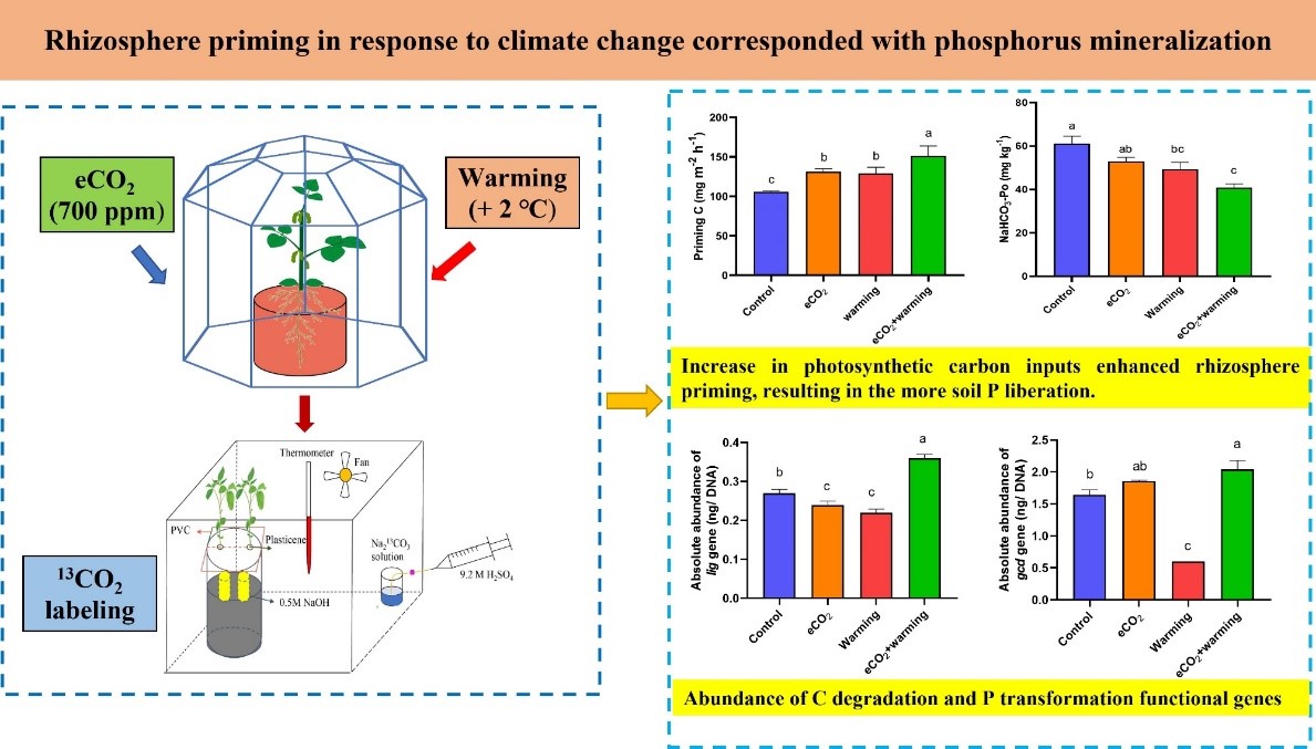 中國科學院東北地理所農田分子生態學科組研究人員,利用開頂式氣候室(OTC)模擬大氣CO2濃度和溫度升高,利用13C示蹤技術來區別土壤呼吸來源植物碳和土壤碳,解析大豆生育期間的土壤呼吸、磷轉化以及相關功能基因豐度,旨在探究氣候變化引發的根際激發效應與土壤磷素轉化的關聯,最終明確土壤微生物功能在碳磷協同轉化中的作用。
