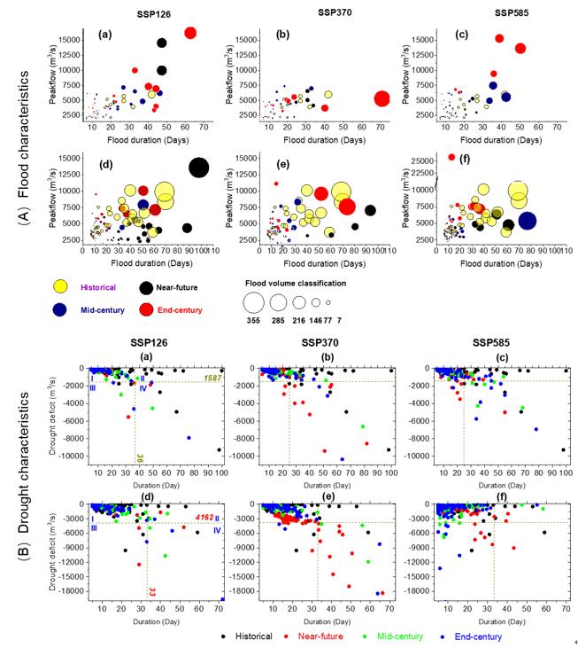 注:A:洪水持續時間-洪峰流量-洪量關系特征;B:干旱強度-持續時間關系。歷史時期(Historical):1971-2020年;近期(Near-future):2026-2050;本世紀中葉(Mid-century):2051-2075;本世紀末(End-century):2076-2100