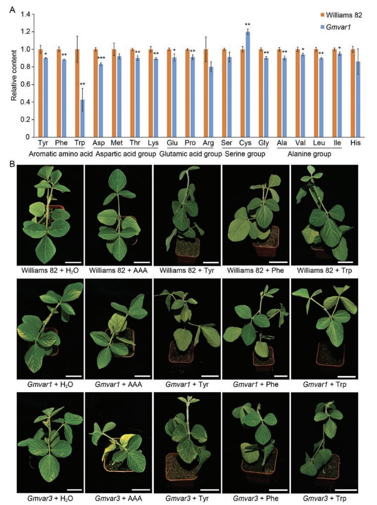 近日,中國科學(xué)院東北地理與農(nóng)業(yè)生態(tài)研究所大豆功能基因組學(xué)學(xué)科組從人工誘變大豆群體中鑒定了四個葉片黃綠雜色突變體,Gmvar1、Gmvar2、Gmvar3和Gmvar4(圖1)。基于圖位克隆、等位基因鑒定實驗和CRISPR基因敲除突變體,證明突變的GmCS1控制Gmvar突變體的葉片黃綠雜色表型(圖2)。GmCS1編碼大豆的分支酸合酶,Gmcs1突變體中苯丙氨酸、酪氨酸和色氨酸的含量顯著降低(圖3)。對Gmvar突變體外源施加三種芳香族氨基酸混合物以及僅施加苯丙氨酸,可以使突變體葉片黃綠雜色表型的恢復(fù)(圖3)。在Gmvar突變體中,與代謝和生物合成相關(guān)的各種生物過程和信號通路被改變。