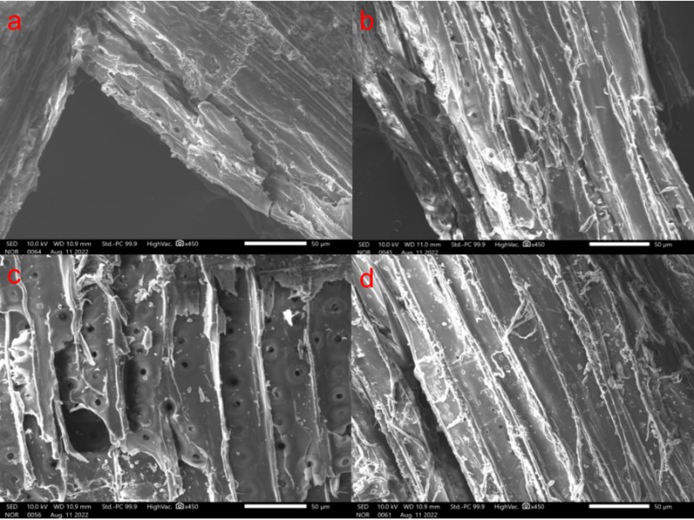 圖2UBC300(a,b)和SBC300(c,d)吸附前(a,c)和吸附后(b,d)的SEM圖像