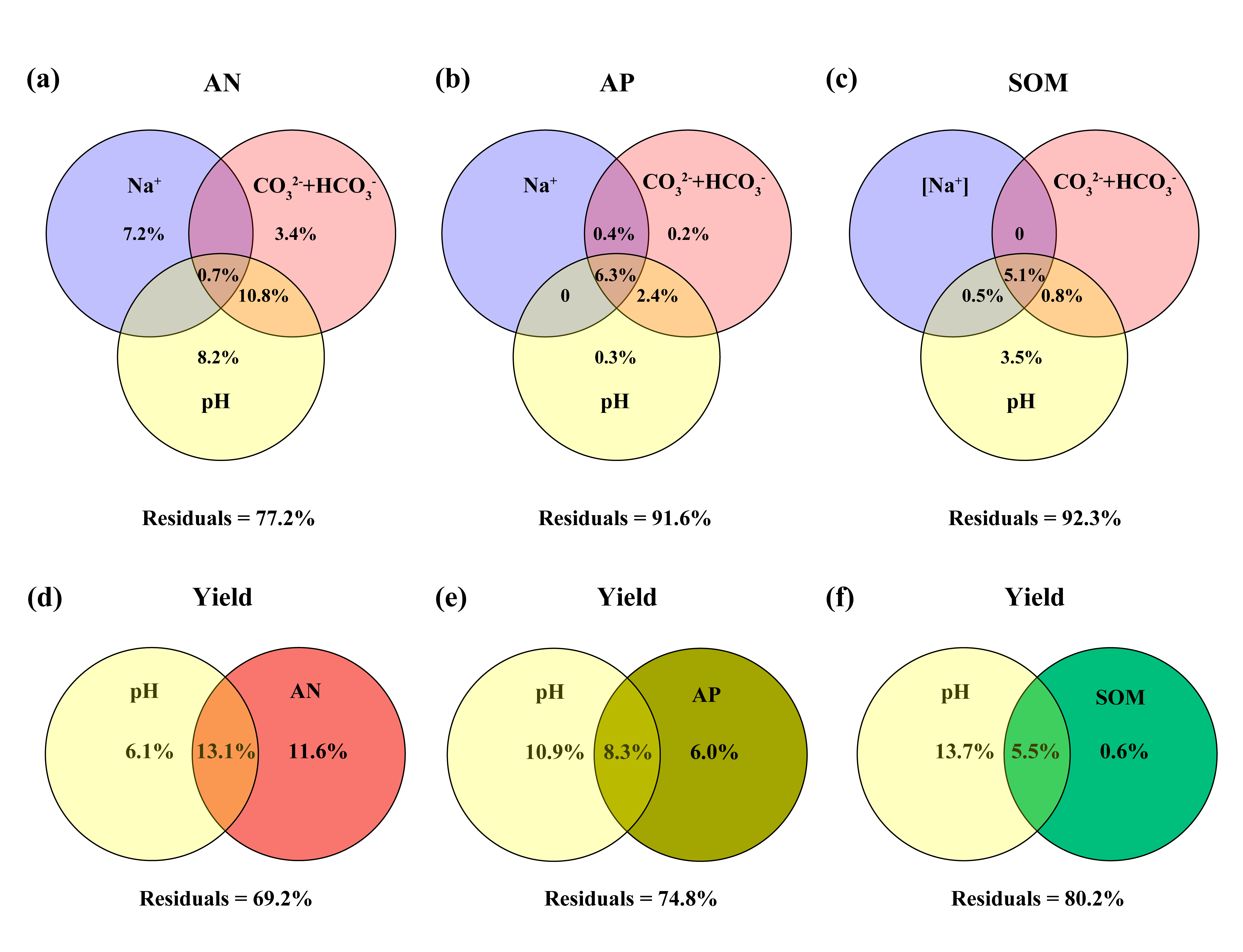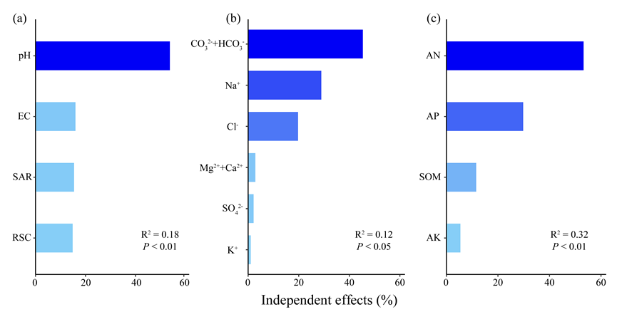 近期,東北地理所科研人員利用吉林大安農(nóng)田生態(tài)系統(tǒng)國(guó)家野外科學(xué)觀測(cè)研究站內(nèi)隨機(jī)采集的不同鹽堿程度稻田水稻植株和土壤樣品,進(jìn)行科學(xué)分析檢測(cè),通過(guò)層次分割和結(jié)構(gòu)方程模型定量評(píng)估了土壤不同化學(xué)指標(biāo)對(duì)水稻產(chǎn)量的獨(dú)立和綜合影響。結(jié)果表明,土壤pH、[CO32?+HCO3?]和堿解氮(AN)是限制蘇打鹽堿地水稻產(chǎn)量最重要的土壤鹽堿參數(shù)、鹽分離子和養(yǎng)分指標(biāo)。在這些因子中,高濃度的CO32?和HCO3?導(dǎo)致了土壤高pH,土壤高pH是限制蘇打鹽堿地水稻產(chǎn)量的關(guān)鍵,而提高土壤AN含量具有抑制pH和碳酸鹽毒害,提升水稻產(chǎn)量的重要作用。尤其在重度鹽堿土(9 ≤ pH < 10)上,提升土壤AN含量,水稻會(huì)表現(xiàn)出更高的增產(chǎn)潛力。因此,降低土壤[CO32?+HCO3?]導(dǎo)致的高pH環(huán)境的同時(shí),提升土壤氮水平是提高鹽堿地水稻產(chǎn)量的關(guān)鍵。
