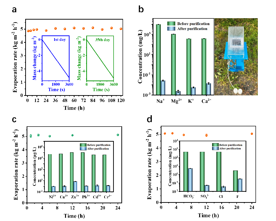 圖2. (a)SIPH5在天然海水中連續(xù)太陽能脫鹽120小時(shí)的耐久性測試?插圖:太陽能脫鹽實(shí)驗(yàn)中SIPH5在海水中最初1小時(shí)和在海水中浸泡30天后1小時(shí)內(nèi)的質(zhì)量變化?(b)凈化前后天然海水中主要離子濃度和室外太陽能凈水系統(tǒng),該系統(tǒng)在本實(shí)驗(yàn)中用于海水淡化、工業(yè)廢水和蘇打鹽堿水的凈化?(c, d) SIPH5在工業(yè)廢水(c)和蘇打鹽堿水(d)中的穩(wěn)定性和凈化能力評估