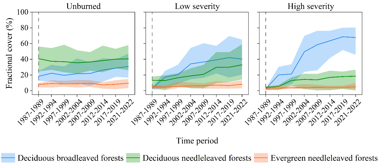 圖2. 不同燃燒強度區域中森林類型覆蓋率的時間序列