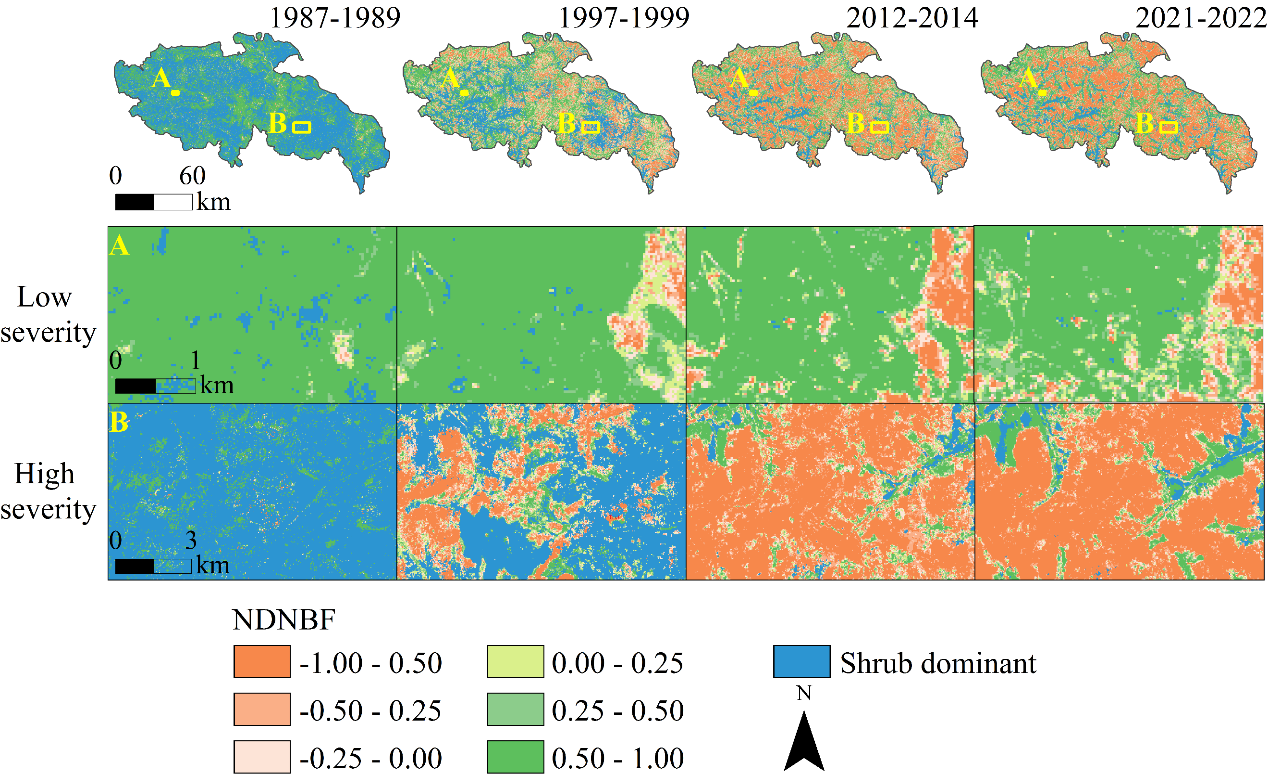 中國科學院東北地理與農業生態研究所景觀生態過程研究團隊對特大火災后森林恢復力進行了多角度綜合評估,重點研究了1987年大興安嶺特大火災后,西伯利亞北方森林光譜及組成的短期和長期恢復力。研究團隊利用1987-2022年間Landsat數據和regression-based unmixing 混合像元分解方法,對西伯利亞北方森林的森林類型覆蓋度進行了制圖,生成了森林類型覆蓋度的長時間序列數據,并結合光譜指數對不同燃燒強度下的森林光譜和組成恢復力進行了評估。