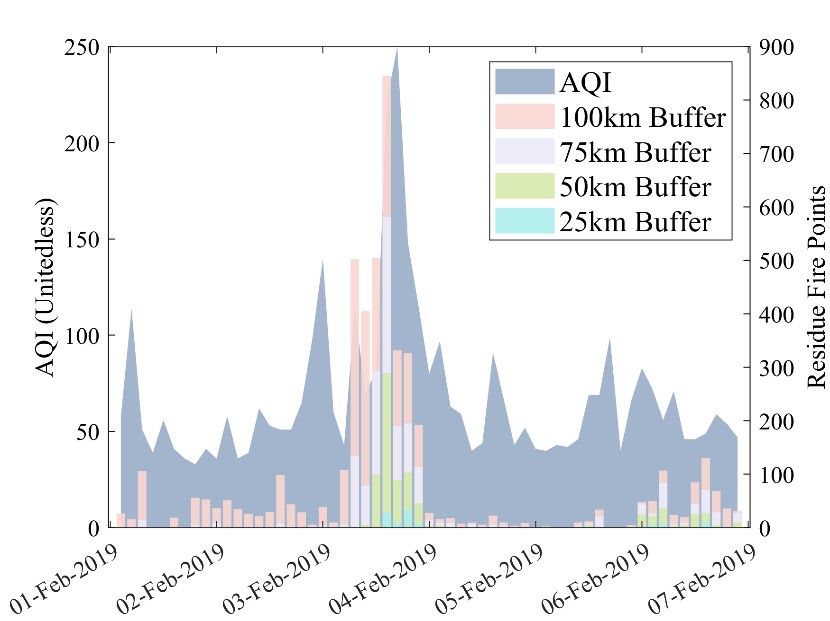 本研究通過提取可見紅外成像輻射儀(VIIRS)火點(diǎn)數(shù)據(jù)、中分辨率成像光譜輻射儀(MODIS)燃燒面積數(shù)據(jù),對比研究了這兩種不同秸稈焚燒參數(shù)與大慶市為中心不同緩沖區(qū)空氣質(zhì)量的相關(guān)性。