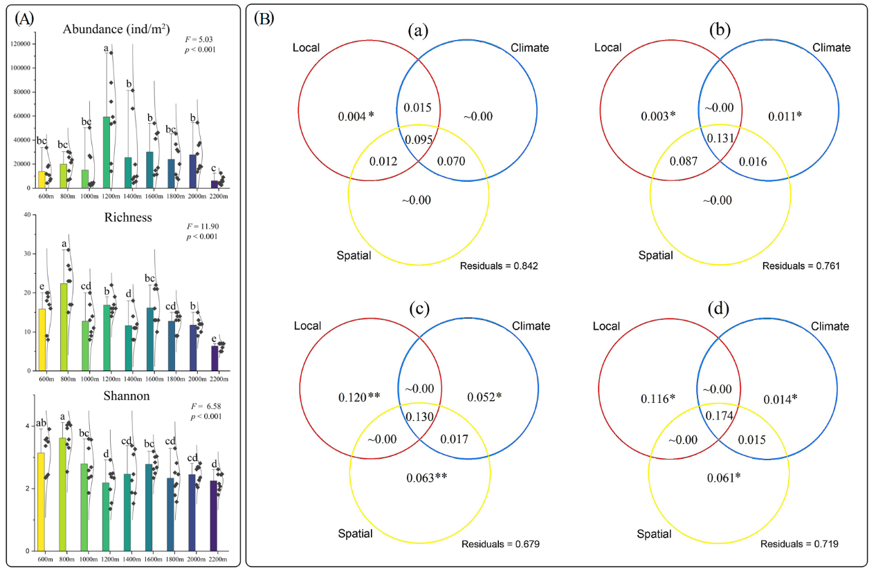 研究表明,長白山地土壤甲螨物種數隨海拔升高而下降,分布密度呈中海拔(1200m)最高的單峰型格局;此垂直帶格局由局域生境特征、氣候特征(年均溫和年降水量)和空間過程(經緯度坐標和海拔)共同決定。其中,土壤局域生境因子總磷(TP)、銨態氮(NH4+-N),年均溫(MAT)、年降水量(MAP)和海拔是決定甲螨群落空間格局的關鍵變量。