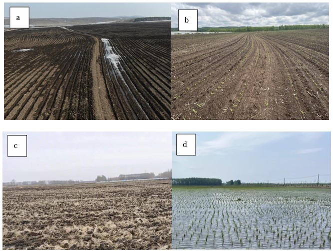 圖2. 水田與旱田在不同月份狀態(tài)(a)4月份旱田(b)5月份旱田(c)4月份水田 (d)5月份旱田