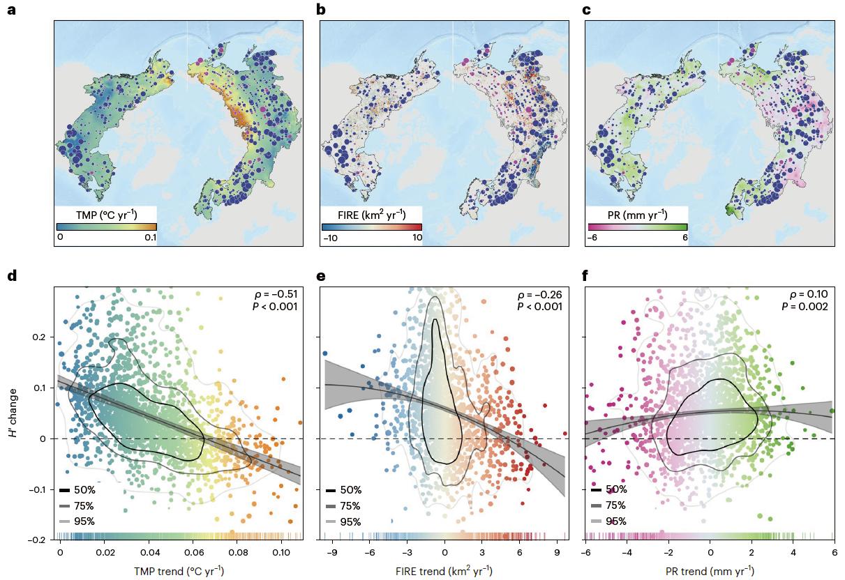 研究發(fā)現(xiàn)自2000年以來,北方森林的樹種多樣性(以香農(nóng)多樣性指數(shù)H'表示)平均增加了12%;樹種多樣性對(duì)氣溫升高表現(xiàn)出積極響應(yīng),但隨著溫度變化的加劇,這種關(guān)系逐漸減弱。在極端升溫地區(qū)(溫度增加超過0.065°C/年),樹種多樣性受到了負(fù)面影響。此外,該研究還發(fā)現(xiàn),多樣性的增加與北方森林生物量的生產(chǎn)力和時(shí)間穩(wěn)定性的增加顯著相關(guān)。這表明,氣候變暖驅(qū)動(dòng)的樹種多樣性增加對(duì)北方生態(tài)系統(tǒng)的功能具有積極影響,但在極端升溫地區(qū),這種趨勢(shì)被逆轉(zhuǎn)。本研究通過模型模擬量化了氣候變化背景下樹種多樣性的時(shí)空演變及其對(duì)碳循環(huán)的影響,研究結(jié)果能夠?yàn)橹贫▍^(qū)域性的氣候適應(yīng)策略提供重要的數(shù)據(jù)支持,并有助于預(yù)測(cè)和應(yīng)對(duì)未來極端氣候?qū)ι稚鷳B(tài)系統(tǒng)的影響。