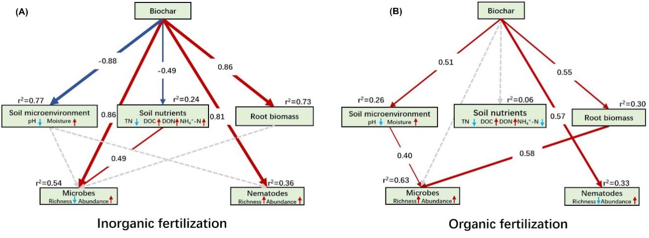 圖2 在無機施肥 (A) 和有機肥料 (B) 條件下生物炭添加對土壤微食物網的直接和間接影響