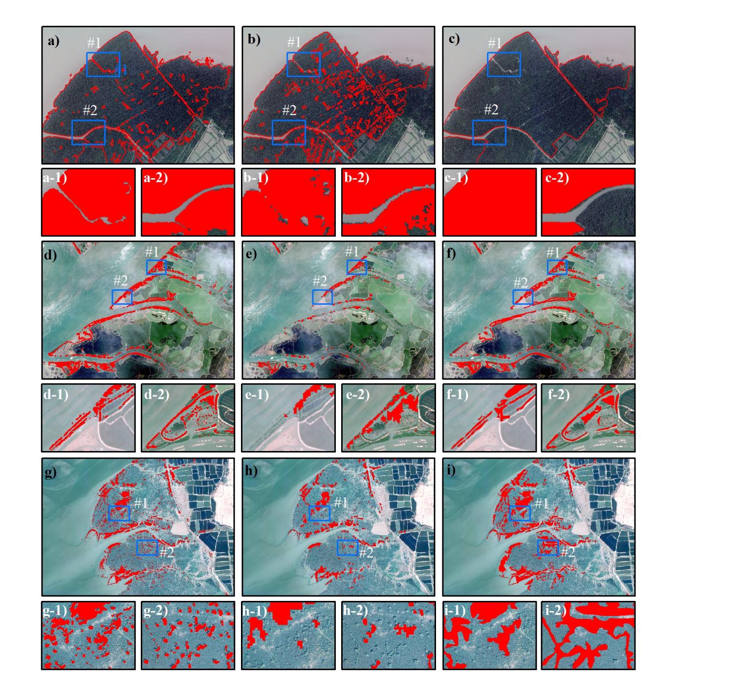 圖1 與現有的無瓣海桑地圖進行比較,重點分析代表性區域內的差異。第一列為本研究繪制的個體水平無瓣海桑地圖,第二列是使用Sentinel-2圖像和隨機森林算法獲取的分布結果,第三列是基于野外調查和谷歌地球影像進行視覺解釋得到的分布結果。