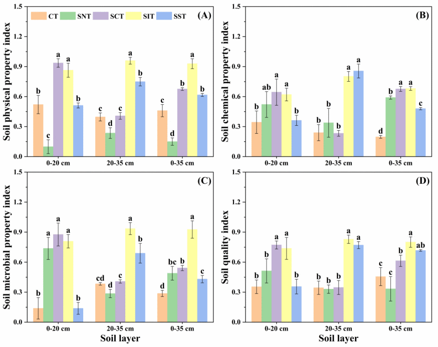 圖1. 秸稈還田對土壤質(zhì)量、土壤物理、化學和微生物性質(zhì)指數(shù)的影響。CT,常規(guī)耕作;SNT,免耕與秸稈還田相結(jié)合;SCT,常規(guī)耕作與秸稈還田相結(jié)合;SIT,深翻與秸稈還田相結(jié)合;SST,秸稈填埋還田。