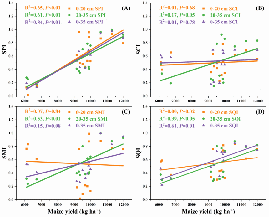 圖2. 玉米產(chǎn)量與土壤性質(zhì)指標的相關(guān)性擬合。SQI,土壤質(zhì)量指數(shù);SPI,土壤物理性質(zhì)指數(shù);SCI,土壤化學性質(zhì)指數(shù);SMI,土壤微生物特性指數(shù)。