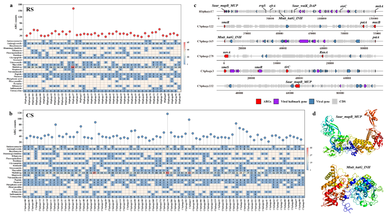 研究表明,東北黑土帶土壤病毒群落存在顯著距離衰減模式。與RS相比,CS中的病毒群落具有更高的群落多樣性和差異顯著的群落結構,但RS和CS中的病毒群落并不具有維度多樣性梯度格局(圖1)。土壤pH是決定病毒群落分布的主要因素,而較高的土壤養(yǎng)分含量顯著降低病毒群落多樣性。Uroviricota、Nucleocytoviricota和Artverviricota是農田土壤中的主要病毒門,同時發(fā)現(xiàn)病毒群落的宿主涉及包括放線菌、變形菌等在內的17個原核微生物門。此外,我們在RS和CS中檢測出了27類抗生素抗性類型,其中多重耐藥型在黑土中的占比最高。結合病毒群落數(shù)據(jù)發(fā)現(xiàn),RS和CS中攜帶ARGs的病毒數(shù)分別占總群落的9.61%和11.4%。進一步拼接構建環(huán)狀噬菌體基因組發(fā)現(xiàn),RS中的溶原噬菌體攜帶了29.7%的ARGs,明顯高于CS中的12.5%,而CS中攜帶ARGs的病毒主要為烈性噬菌體(圖2)。本研究揭示了黑土帶區(qū)域尺度上的兩類農田土壤中病毒和抗生素抗性基因的分布特征及病毒攜帶ARG的裂解溶原策略。